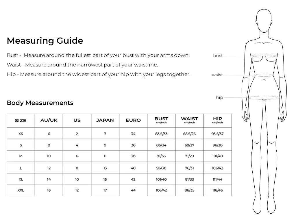 Our eCommerce model, Georgia, is 175cm tall with a 86cm bust, 69cm waist, 95cm hips, and wears a size 8/S.