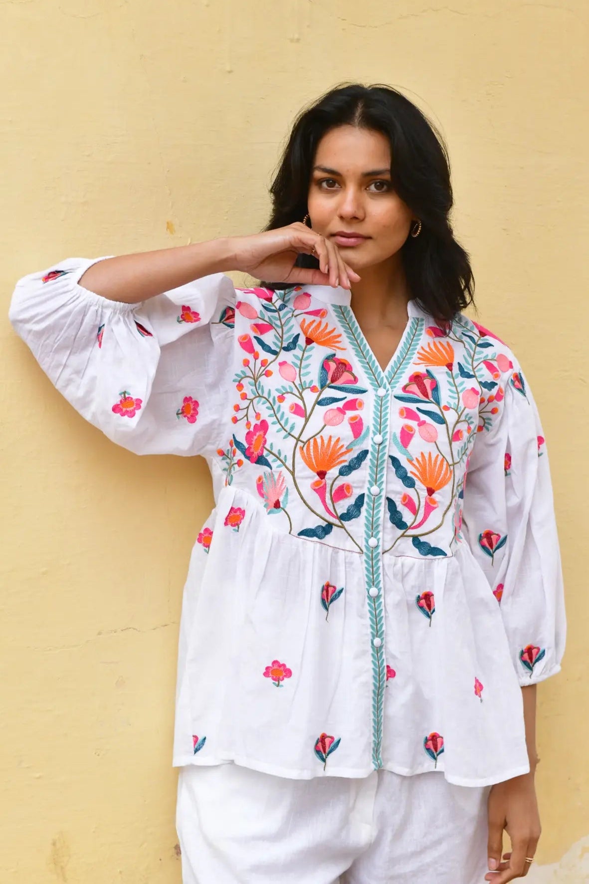 Bring effortless charm to your wardrobe with the Hummingbird Embroidered Shirt. Crafted from 100% breathable cotton, this shirt is elevated by exclusive hummingbird-coloured embroidery for a subtle pop of colour and artisanal detail. Designed with a flattering 3/4 gathered sleeve, a lined bust for comfort, and delicate covered buttons, it blends everyday wearability with timeless elegance. Perfect for pairing with tailored pants or relaxed denim, this versatile piece takes you from workdays to weekends with ease.