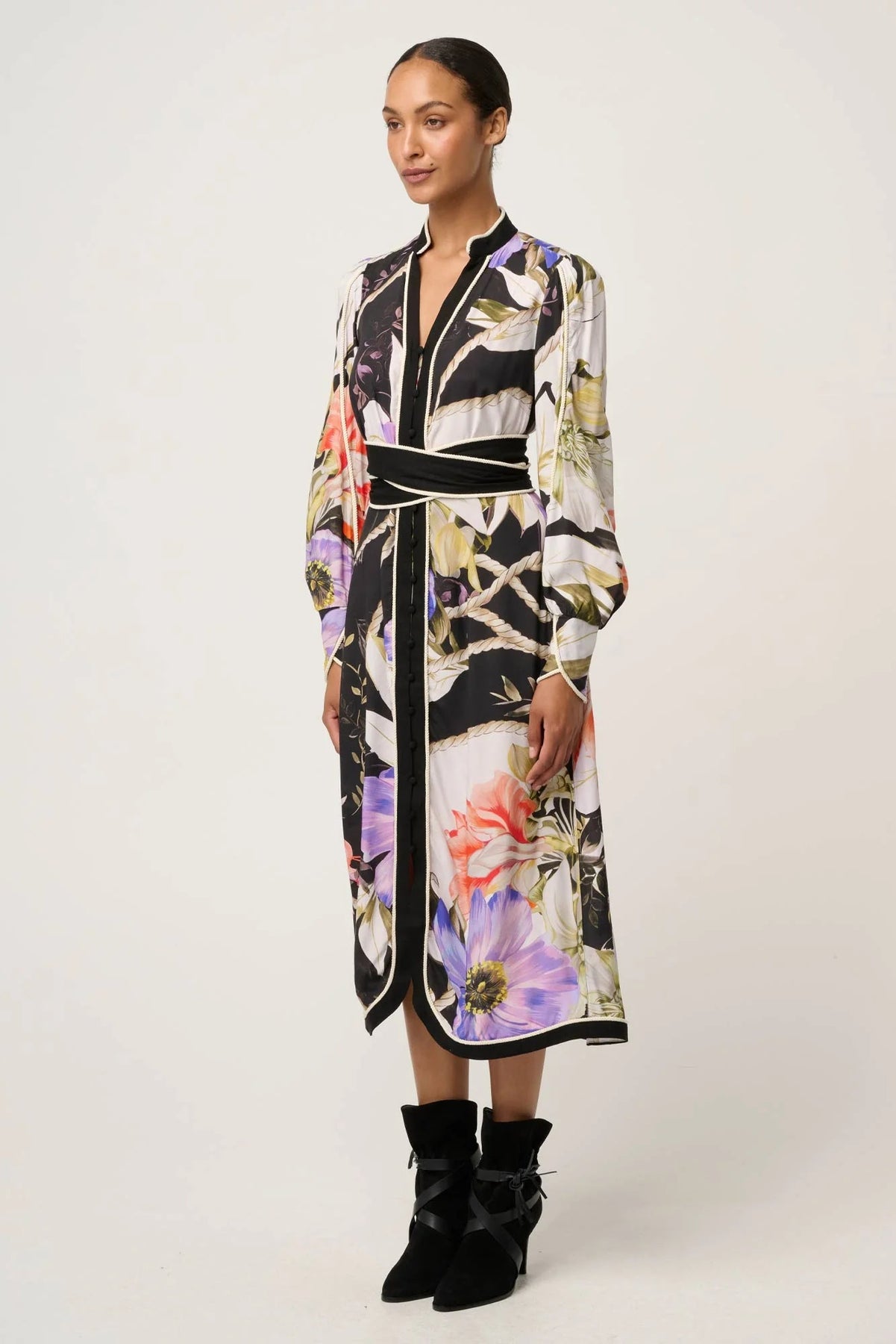 Featuring the exclusive tangled Blossom print, this design showcases oversized floral motifs layered with graphic contrast detailing for a striking visual impact. The signature rope detail belt defines the waist and adds a handcrafted, artisanal finish, while the curved hemline elongates the figure and softens the midi silhouette. A deep V-neckline with contrast trim, softly bloused long sleeves, and a front split complete the look with effortless sophistication.