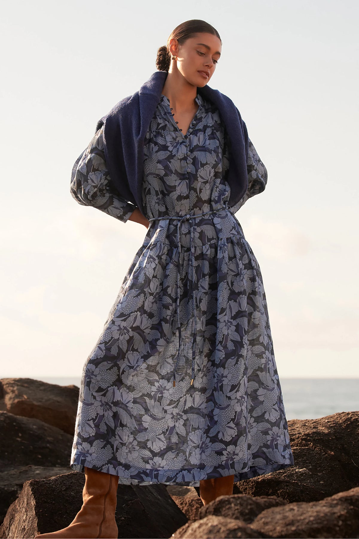 A modern classic with quiet strength. The vesper dress refines a timeless silhouette through considered detail and proportion. A deep blue floral with subtle contrast, Moonstone Garden offers a refined take on romance with a modern, darker edge.