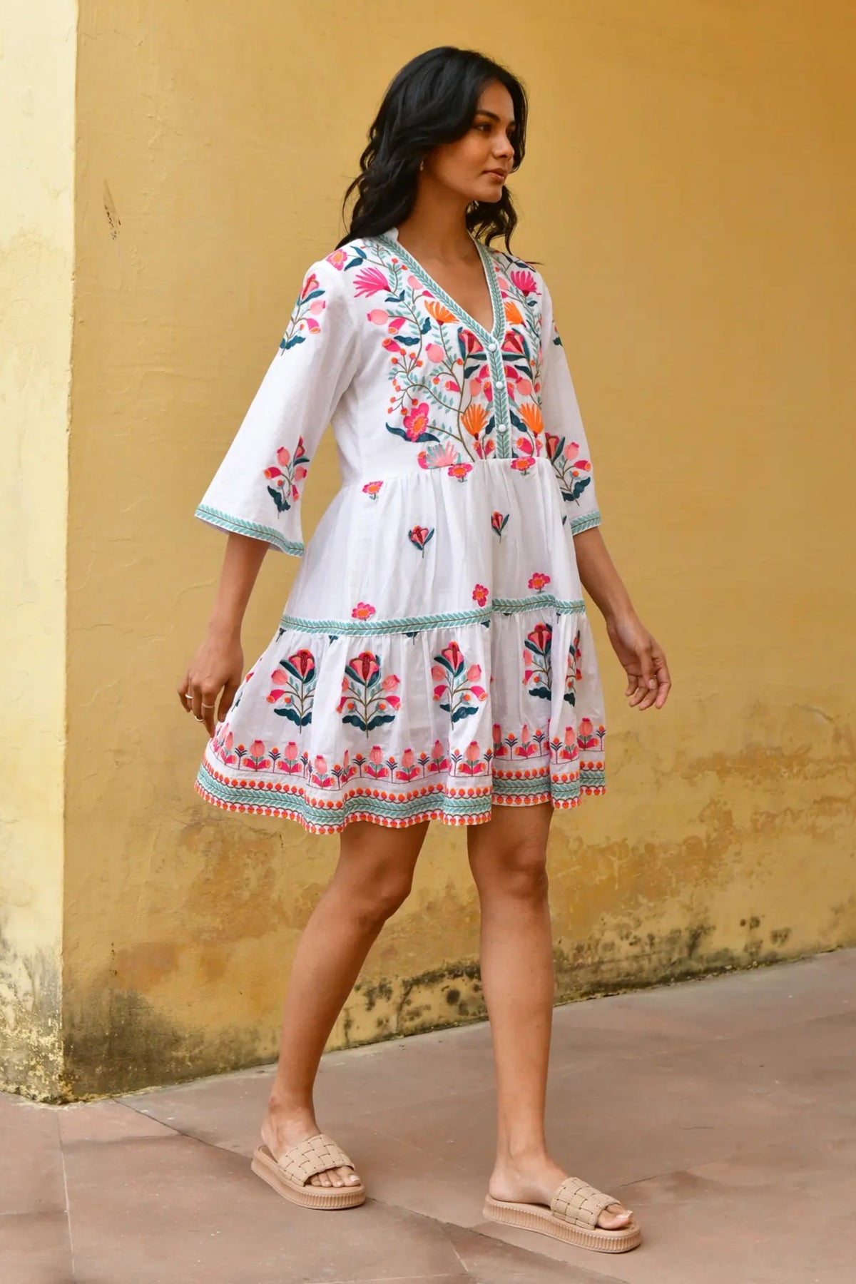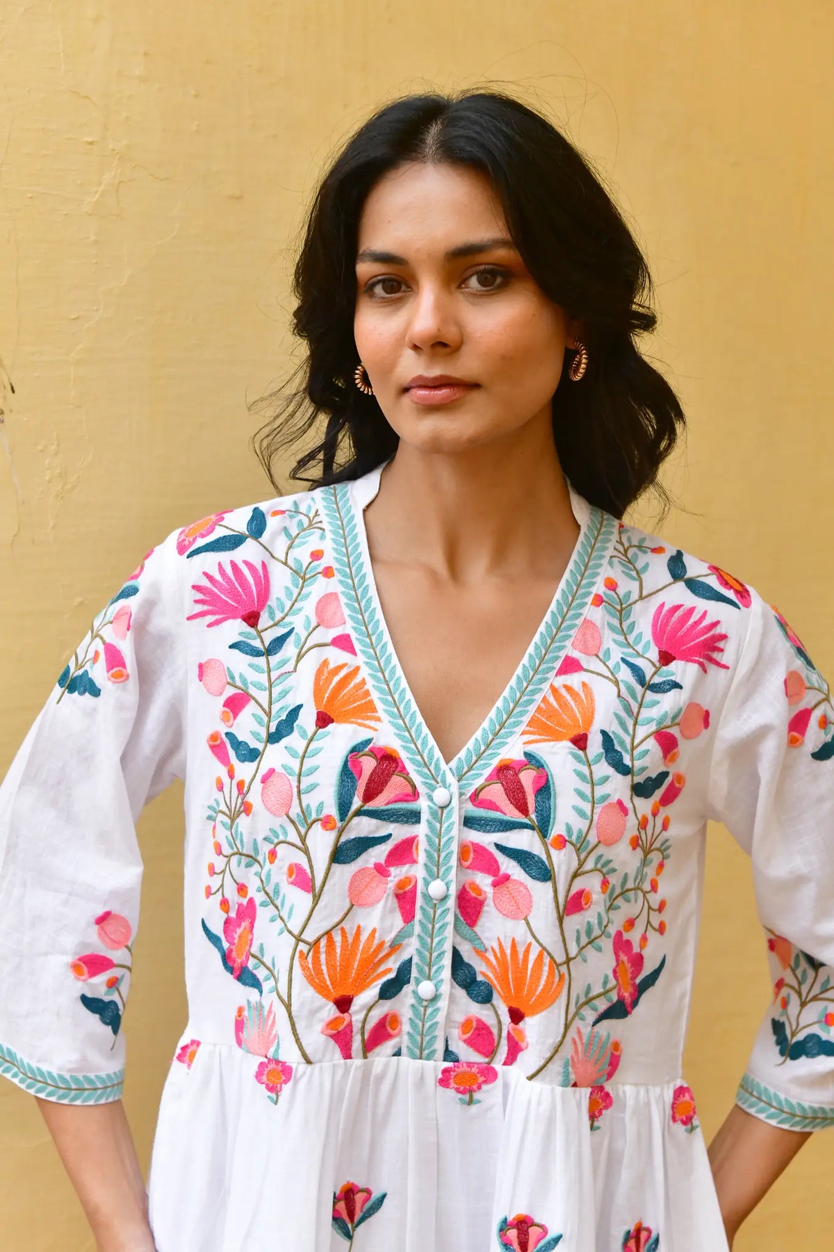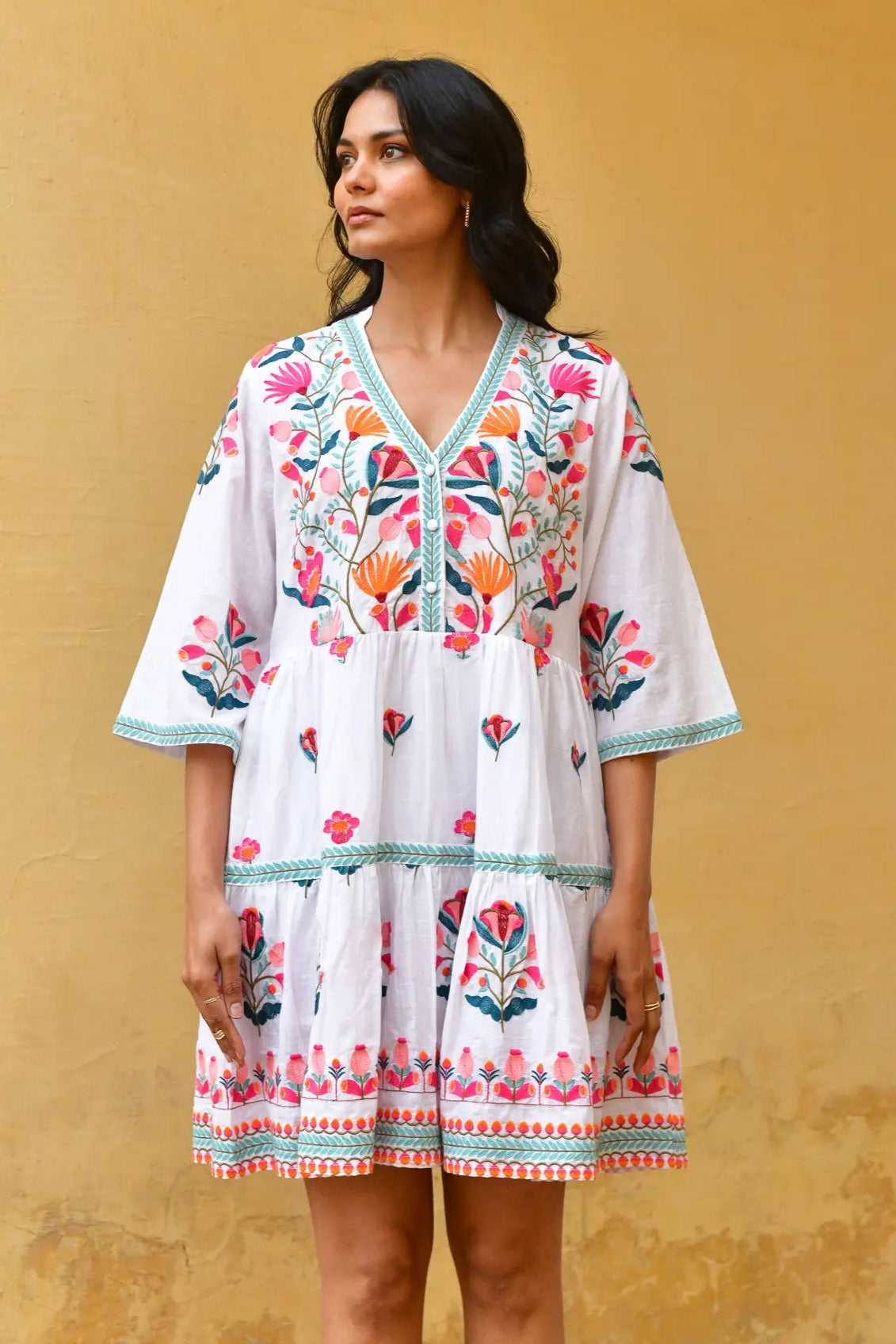 Step into effortless elegance with the Hummingbird Embroidered Swing Dress. Crafted from 100% breathable cotton, this dress features exclusive hummingbird-coloured embroidery for a vibrant, artisanal touch. The flattering swing silhouette is finished with 3/4 bell sleeves and a V-neckline with covered button details for a feminine edge. With a fully lined design for comfort and confidence, it’s the perfect piece to take you from daytime outings to evening occasions with ease.