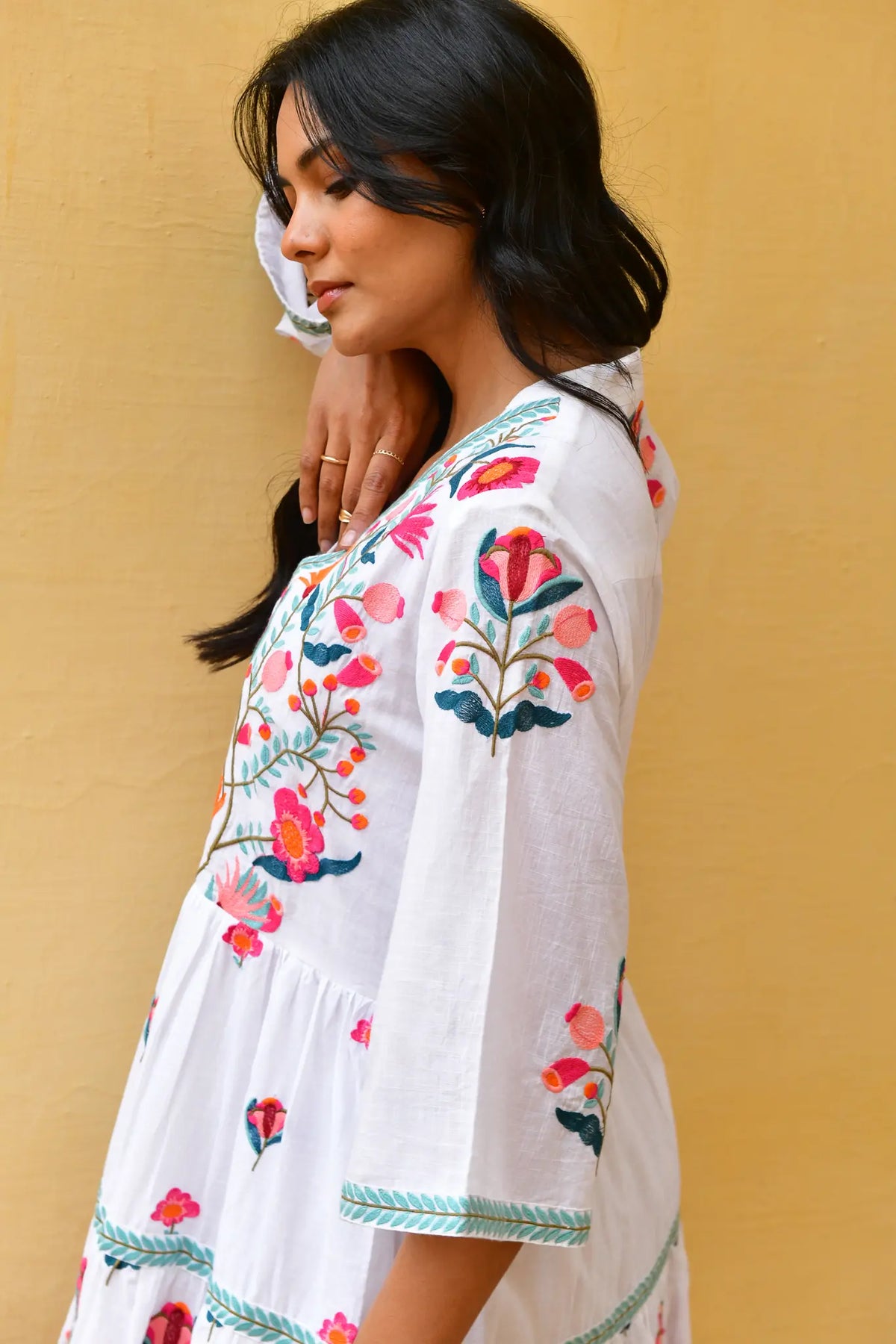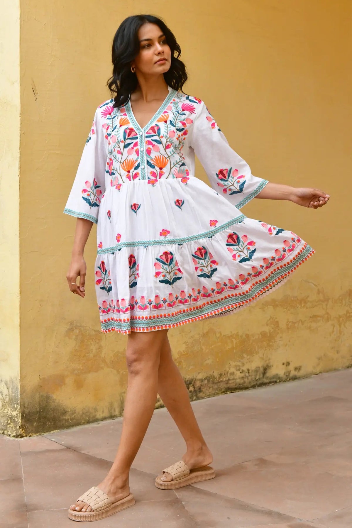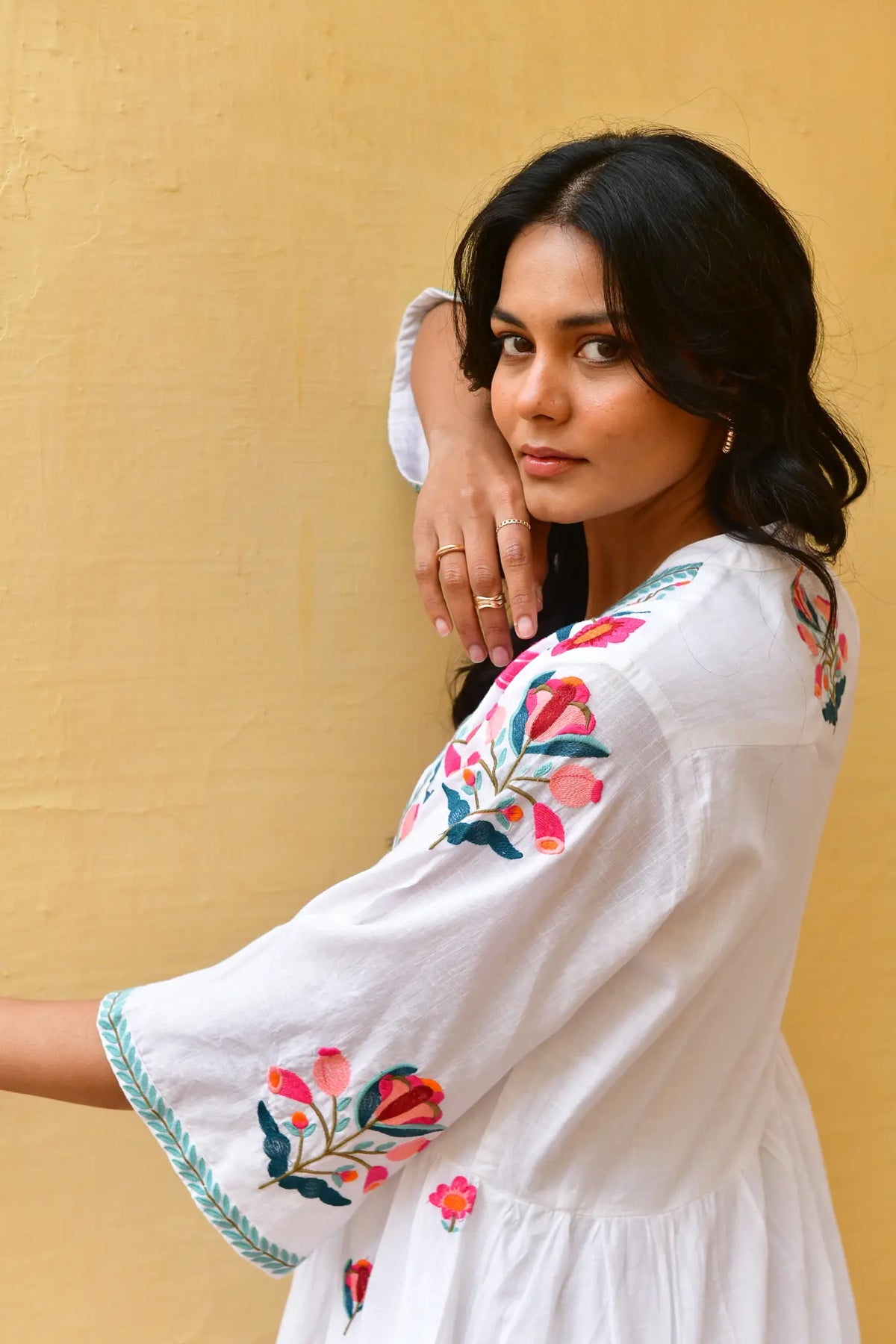 Step into effortless elegance with the Hummingbird Embroidered Swing Dress. Crafted from 100% breathable cotton, this dress features exclusive hummingbird-coloured embroidery for a vibrant, artisanal touch. The flattering swing silhouette is finished with 3/4 bell sleeves and a V-neckline with covered button details for a feminine edge. With a fully lined design for comfort and confidence, it’s the perfect piece to take you from daytime outings to evening occasions with ease.