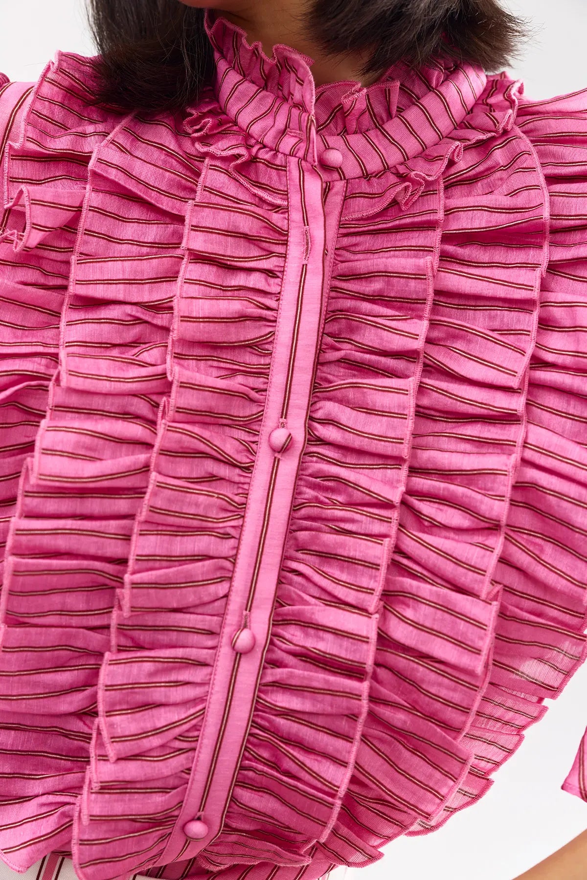 The Leonie Blouse in Poppy Bark Stripe is a statement-making blouse. The vertical stripes and intricate ruffles create a romantic, textured look that makes the blouse perfect for pairing with tailored skirts or trousers.
