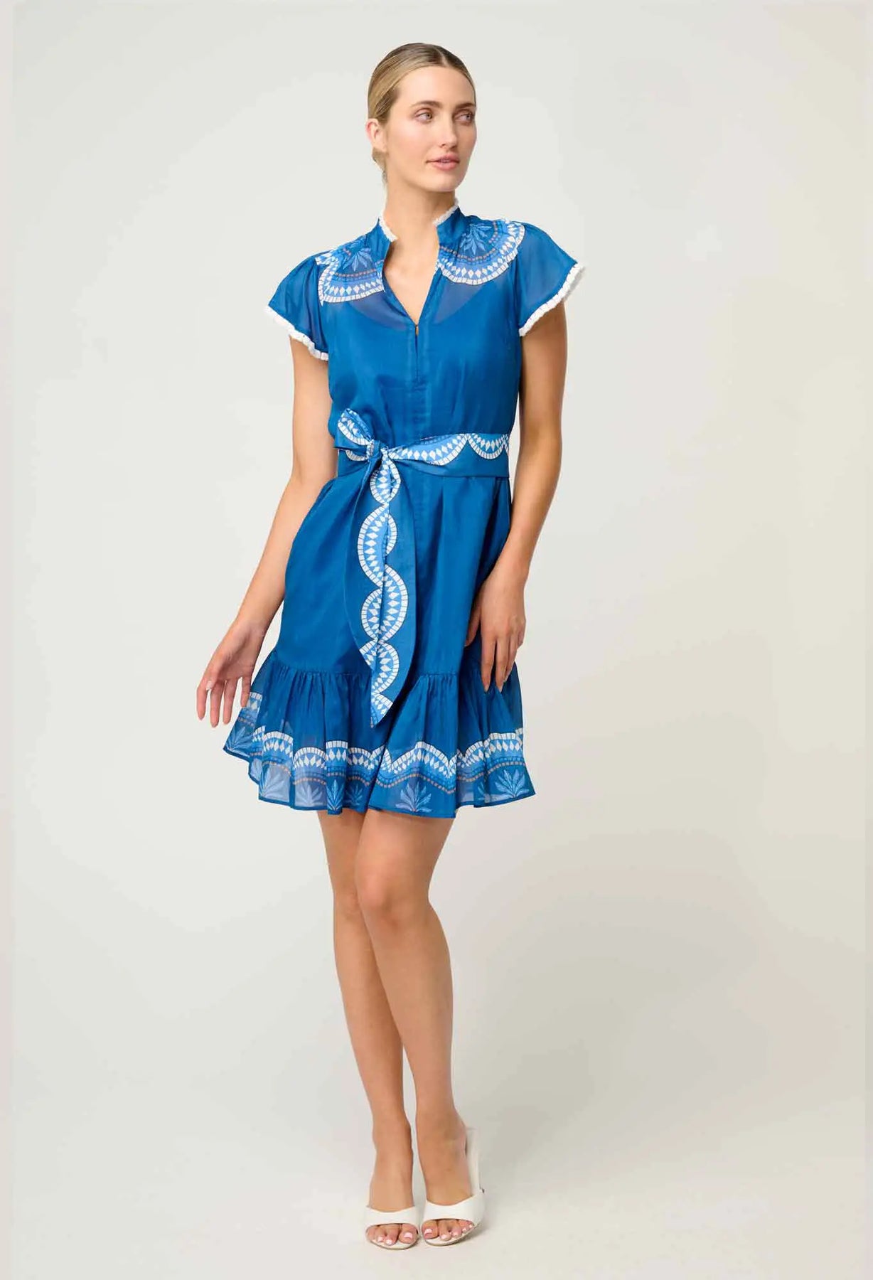 The vivid topaz blue base is elevated with intricate embroidered scallop detailing along the collar, waist tie, and tiered hemline, giving the dress a refined artisanal touch. Designed with a flattering V-neckline, cap sleeves, and a belted waist, the Lilia Dress enhances your silhouette while ensuring comfort and ease of movement. The ruffled skirt adds playful femininity, making it the perfect piece for warm-weather occasions, resort escapes, or weekend gatherings.