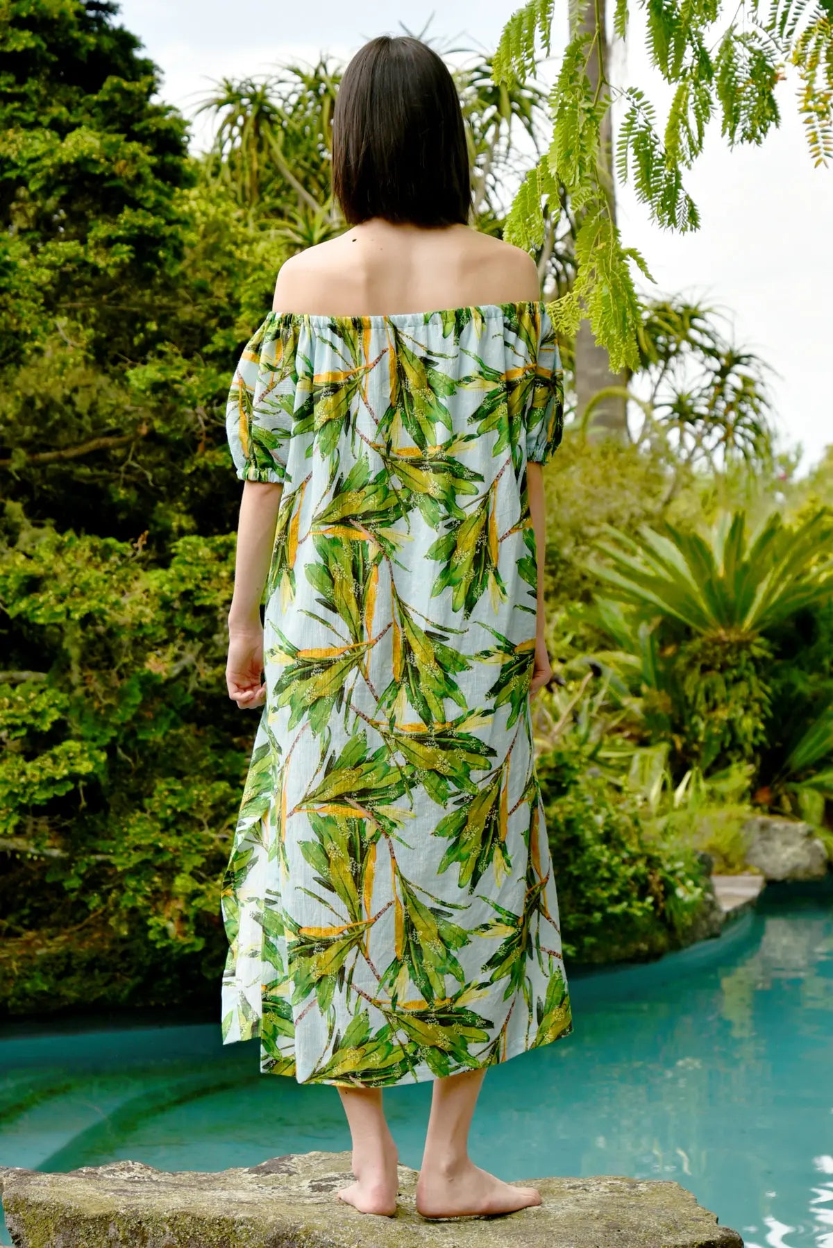 Spotlighting the ‘Sky of Love’ cotton crepe, the tropical printed ‘Shoulder On’ dress combines casual comfort with spring time flavor. An elasticated neckline allows for off-and-on shoulder-wear allowing for multiple styling opportunities. A relaxed silhouette makes this dress a firm favourite for casual-wear when the weather warms up.