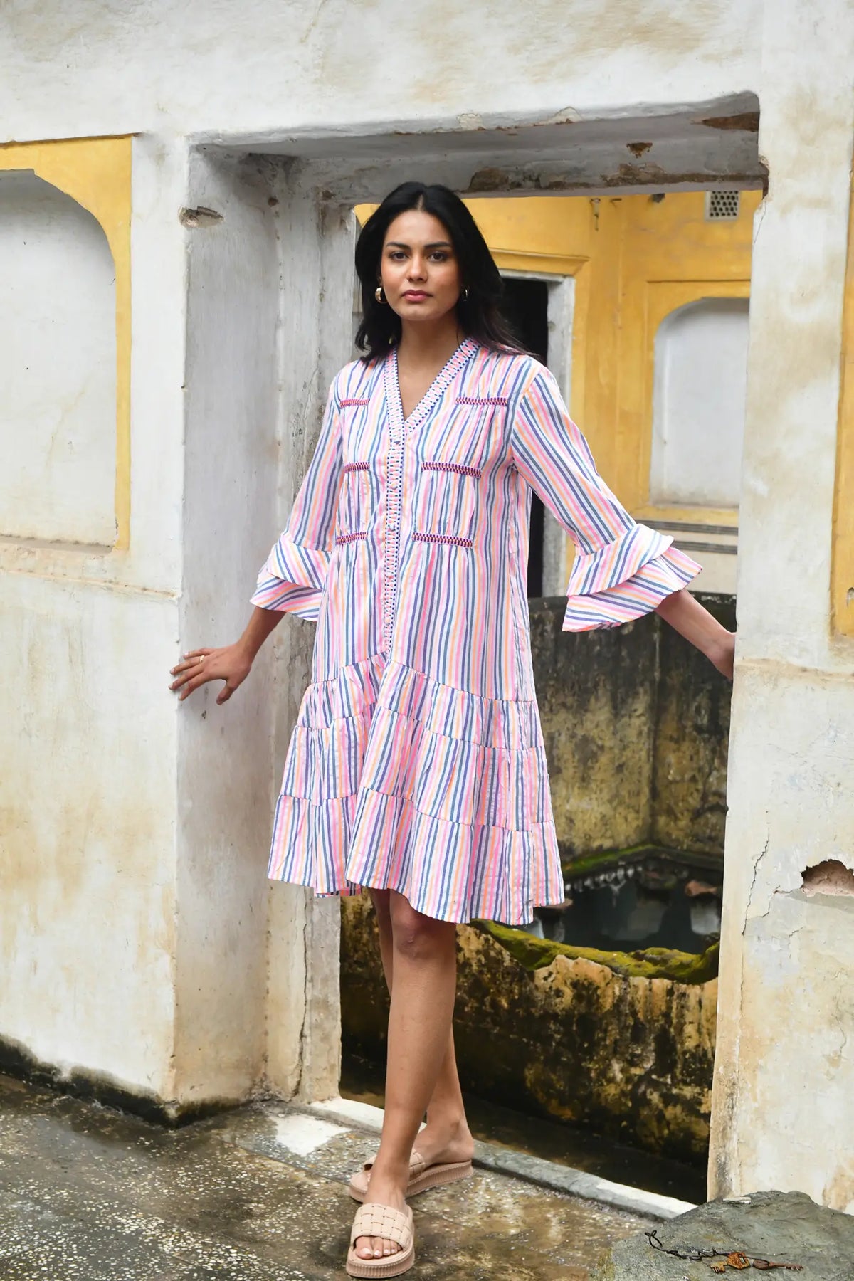 Breezy and beautifully detailed, the Sunset Swing Dress is crafted from 100% cotton seersucker for a lightweight, breathable feel. Featuring designer embroidery trims along the bodice and centre front, this button-through style is finished with 3/4 bell sleeves for a relaxed yet feminine silhouette. Effortless and versatile, it’s the perfect dress for warm days, weekend outings, or dressed-up casual evenings.